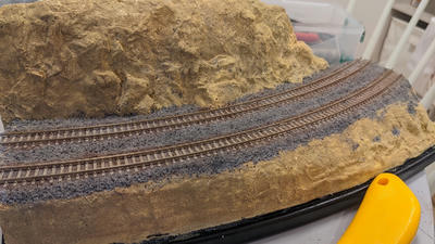 手前の崖側のところは、先にボンド水濃いめに塗って、パラパラ振りかけてみた