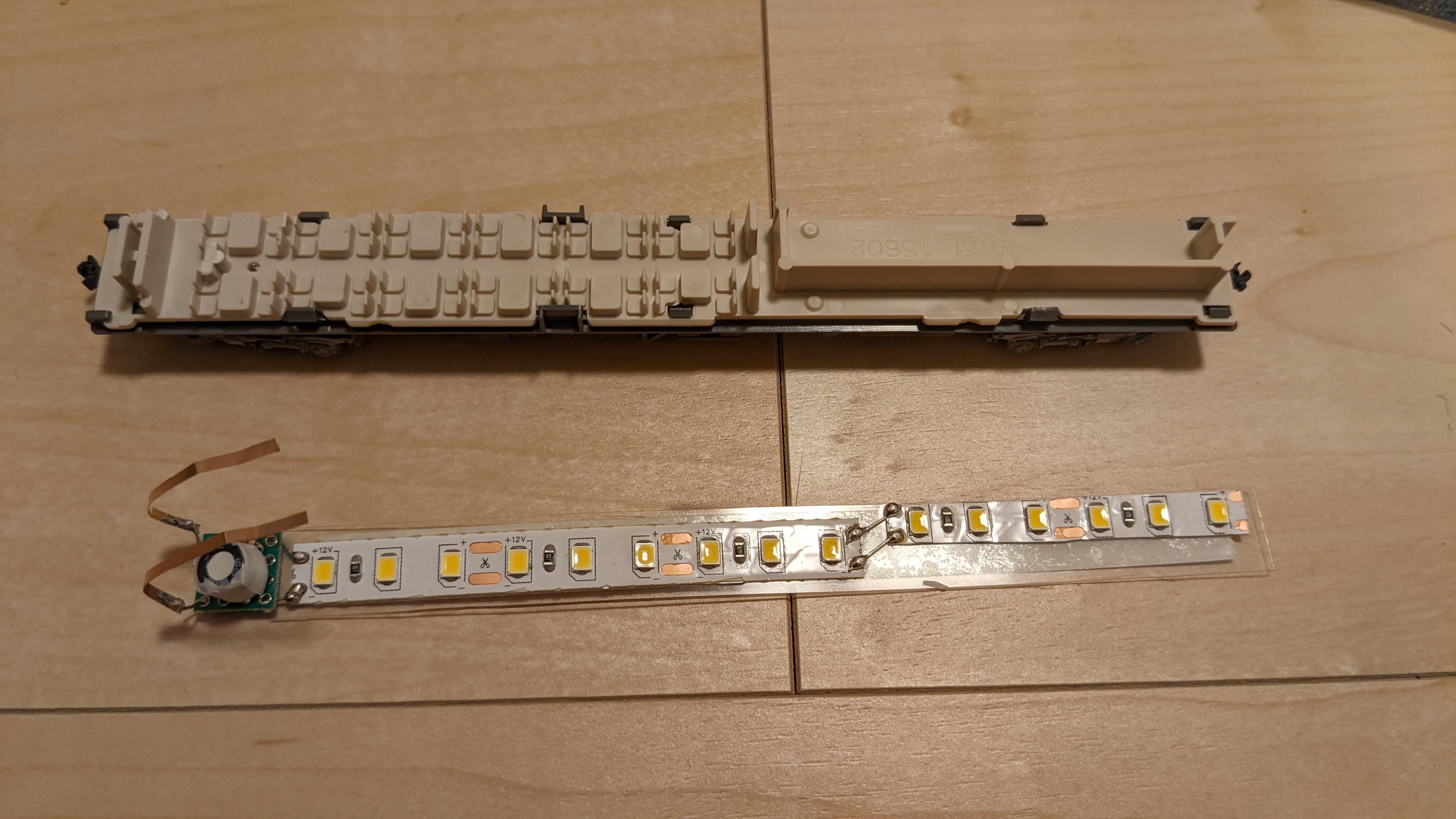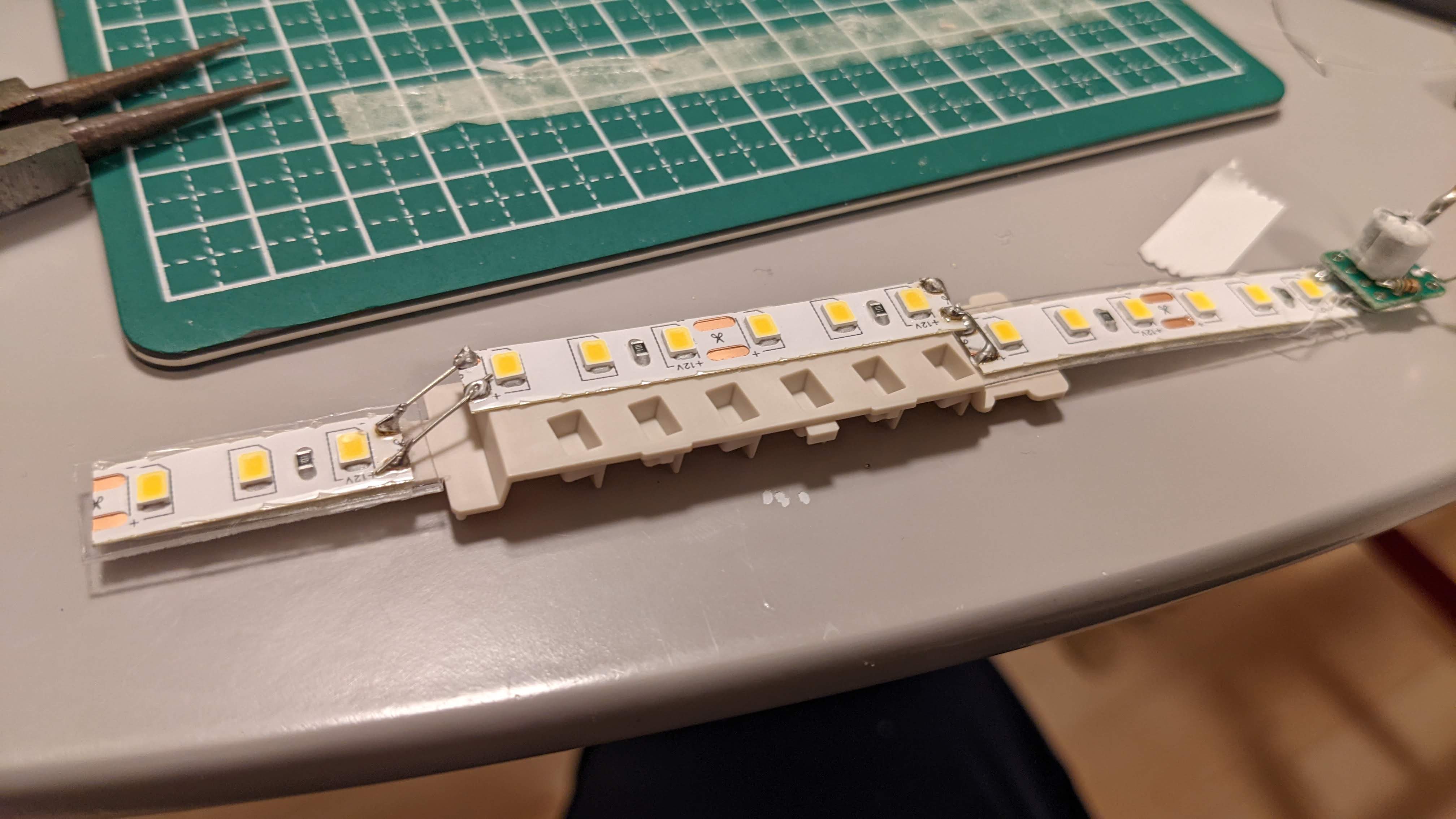 テープLEDは100均の硬質カードケースを12mm幅くらいに切り出したものに貼り付けた。