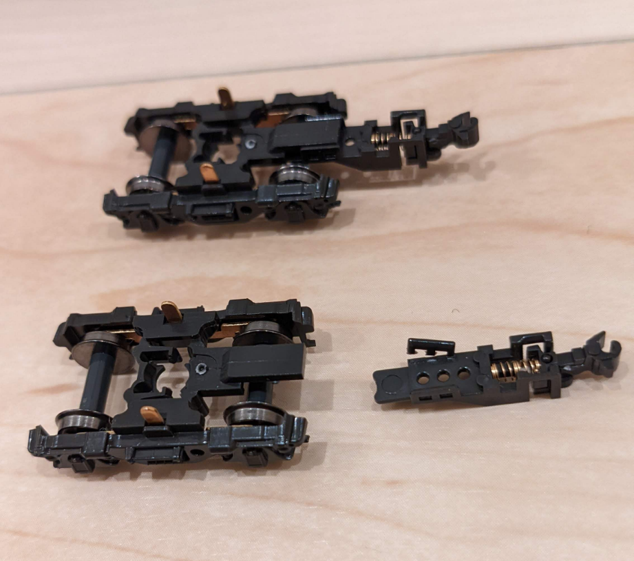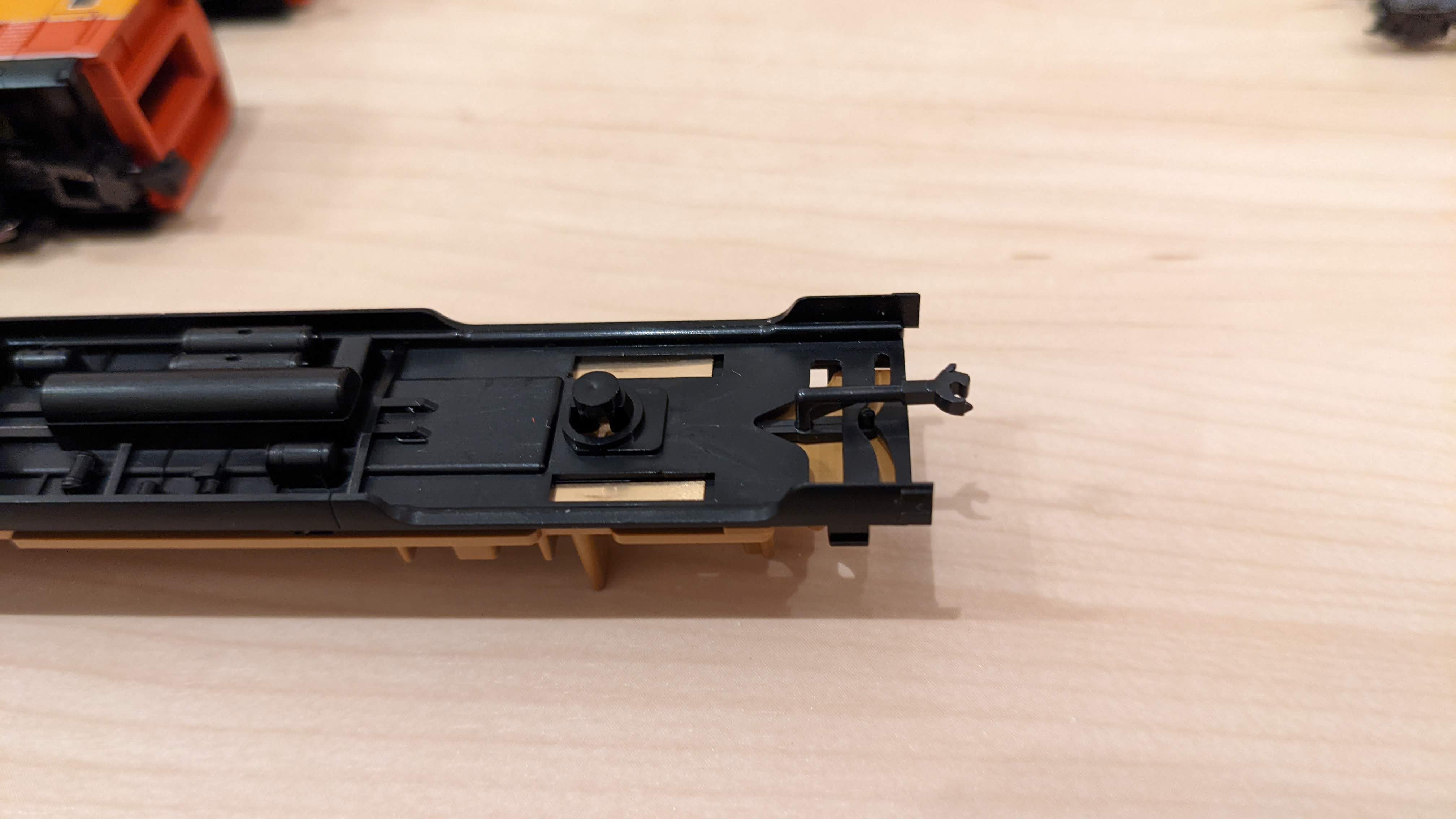 取り付けるには、台車を外して台車マウントのカプラーを根本から外して、ボディを少し外して所定の位置に差し込む感じ。